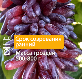 Грозди крупные, средней массой 500-800 г, ягоды средние и крупные, окрашены в темно-фиолетовый или красно-фиолетовый цвет с легким восковым налетом, удлиненной формы, тонкие, заостренные, слегка изогнутые, длинной 4-6 см. Масса ягод 6-8 г.