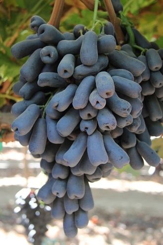 Срок созревания ранне-средний. Грозди крупные, цилиндроконические, средней плотности. Средняя масса гроздей 500-700 г, иногда до 1,2 кг. Ягоды крупные, необычного силуэта, до 6 см в длину – удлиненные, вытянутые, трубчатой формы с характерными вмятинами на концах, темно-синего цвета, покрыты густым восковым налетом. Средняя масса ягод 7-9 г, некоторые до 16 г. Мякоть очень плотная, практически твердая, с низким содержание сока, хрустящая, вкус гармоничный, с фруктовыми тонами. Кожица тонкая, при еде не ощущается. 1 класс безсемянности!